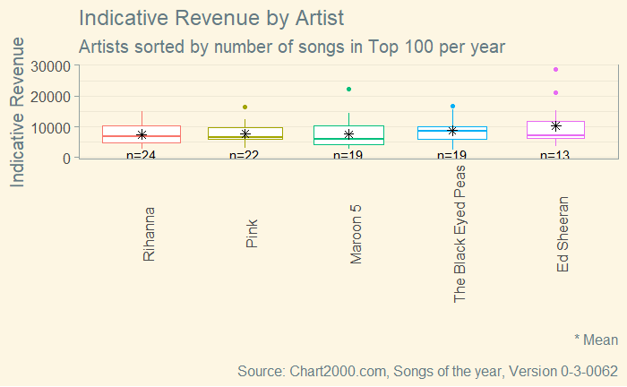 Das erste Boxplot zeigt die Erlöse der Top 5 Künstler / Bands. Ich habe das theme_solarized() aus dem ggthemes-Paket von Jeffrey B. Arnold verwendet, die Künstler nach Anzahl der Songs in den Top 100 sortiert, die y-Achsen-Beschriftung um 90 Grad gedreht, die Schriftgröße erhöht, die Markierungs-Striche an der x-Achse sowie die vertikalen Rasterlinien entfernt.